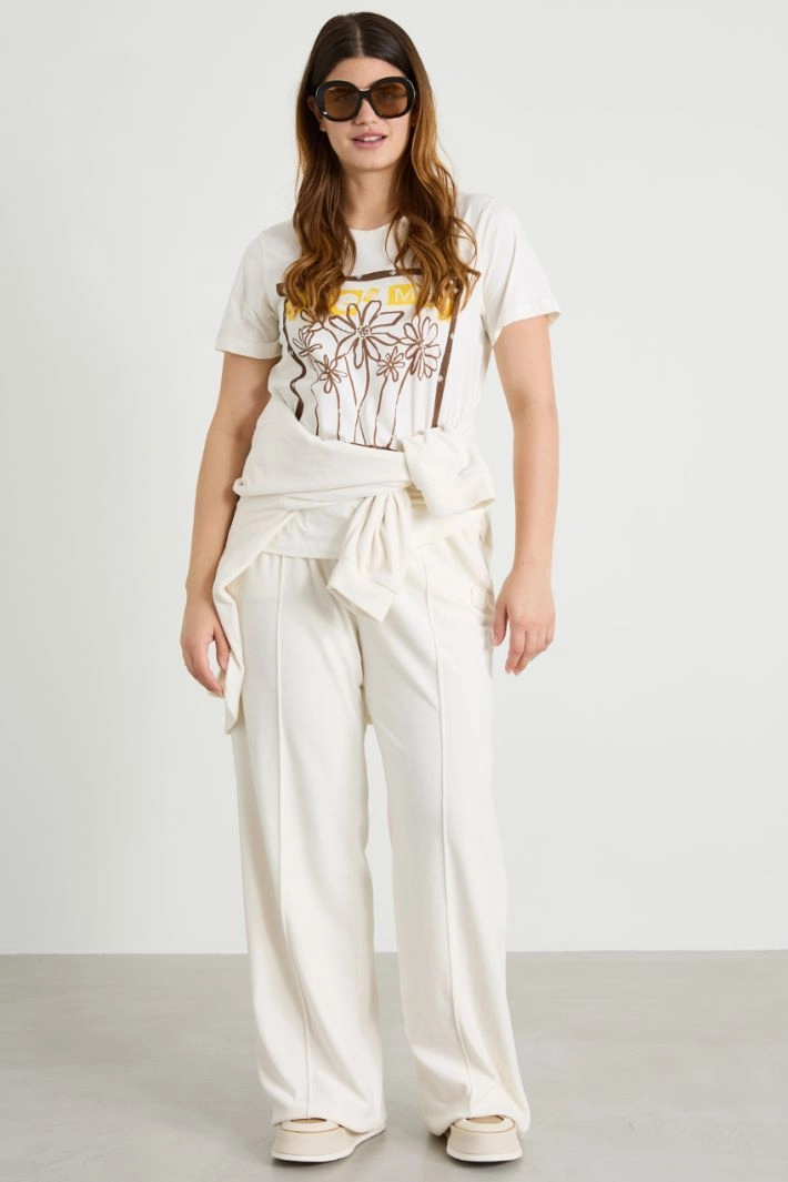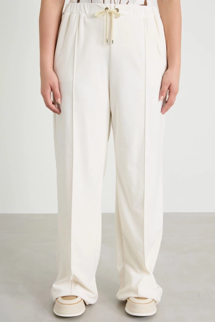 Straight-cut trousers in stretch chenille, with elastic insert and drawstring at the waist, pockets inset in the side seams and pleat sewn along the length.