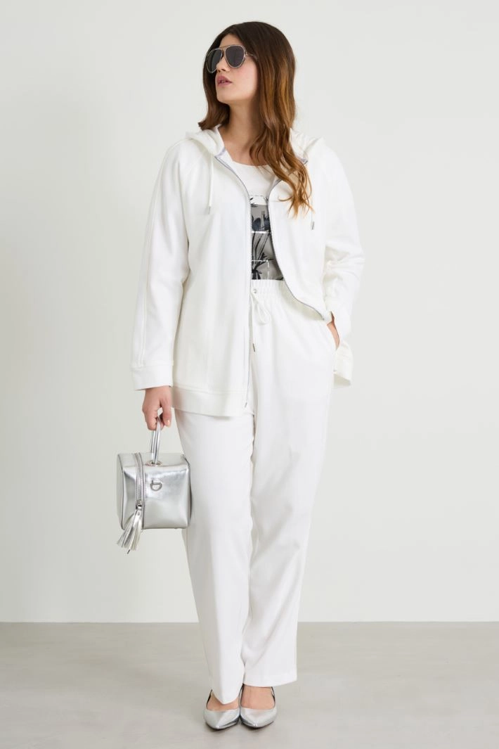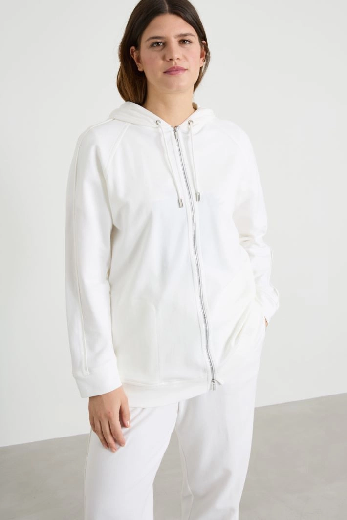 Straight-cut sweatshirt in cotton blend jersey, with hood and drawstring, long raglan sleeves and in-seam pockets with zip. Zip fastening.