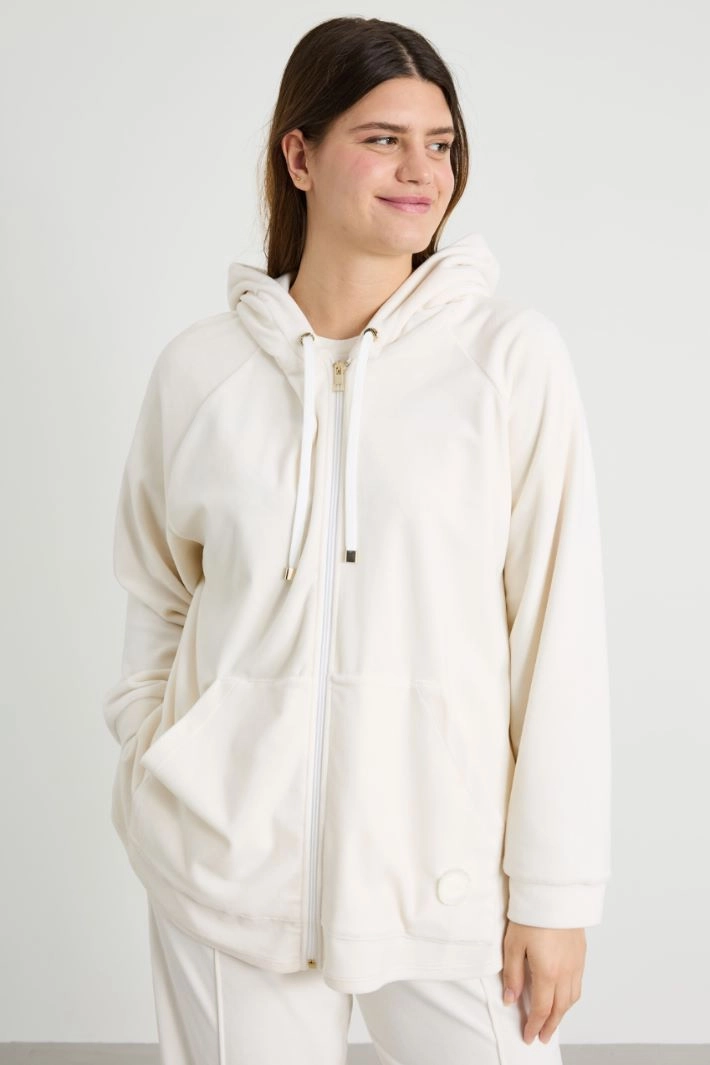 Straight-cut chenille sweatshirt with drawstring hood, long sleeves, kangaroo pockets and asymmetric hem. Zip fastening.