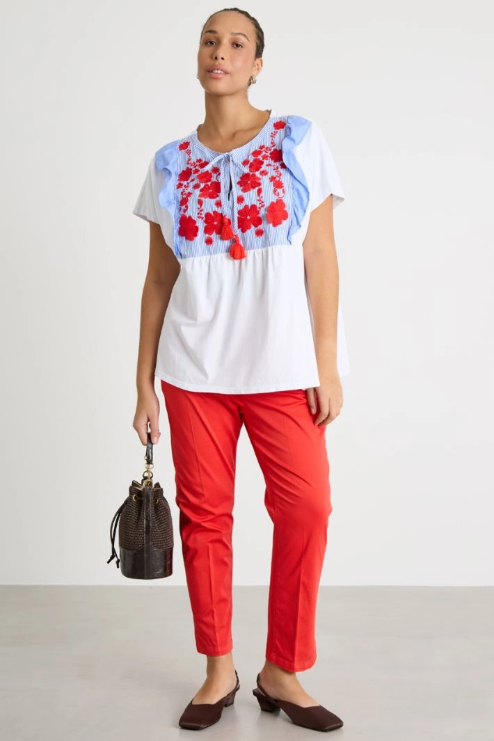 Straight-fit cotton jersey T-shirt with a round neck and short kimono sleeves, featuring a ruffled plastron with placement embroidery and ties.