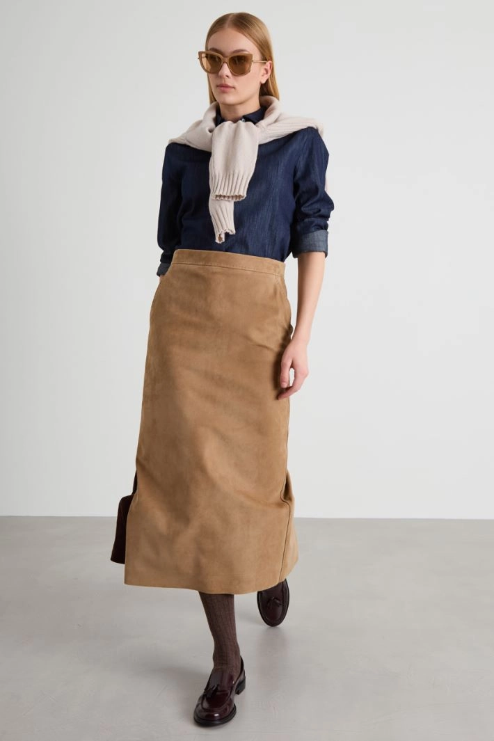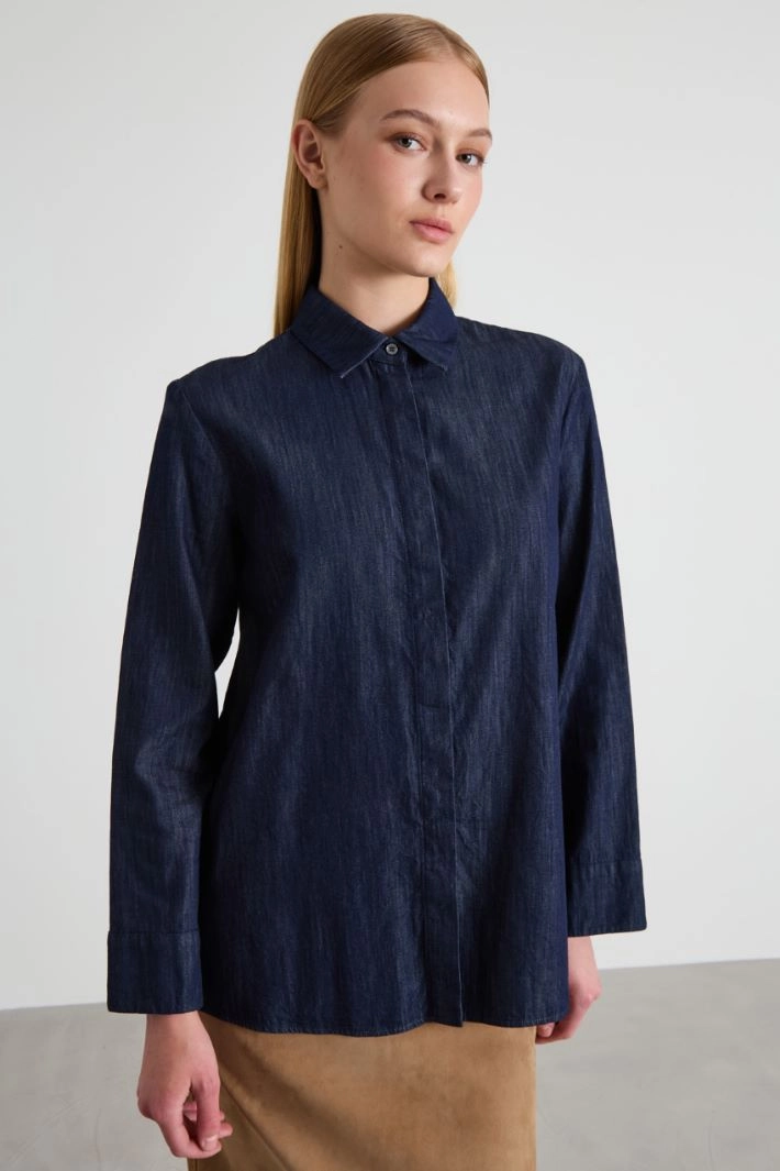 Straight-cut shirt in lightweight pure cotton denim, with a classic collar, long sleeves and a yoke at the back. Side slits and asymmetrical hem that is longer at the back. Hidden button fastening.