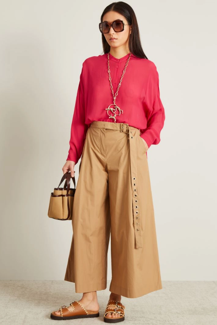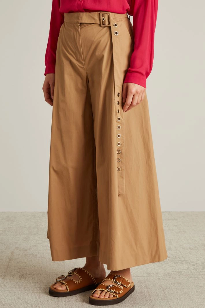Wide-leg cotton trousers with belt and belt loops, French pockets. Fastening with hook, zip and matching belt.