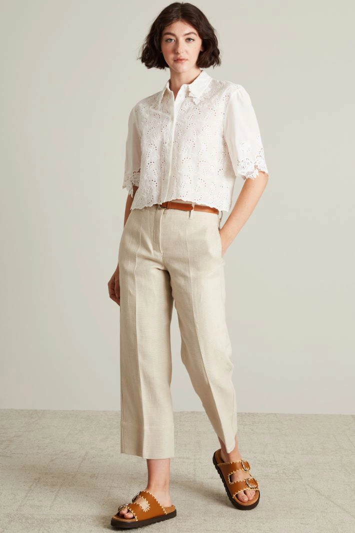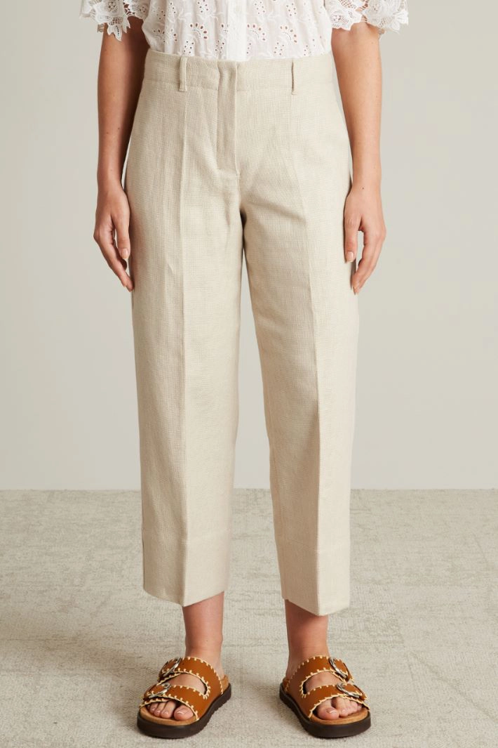 Straight-fit trousers in stretch linen and cotton, with belt loops at the waist, side pockets, single welt pocket on the back, pressed crease lengthwise and hidden fastening with zip, button and hook.