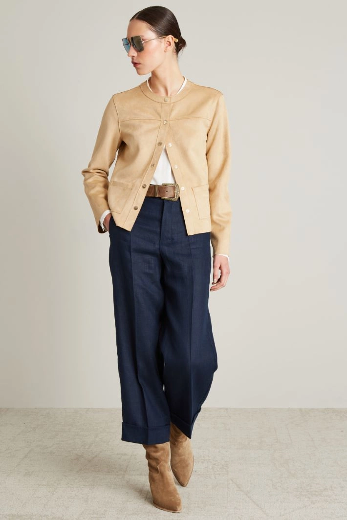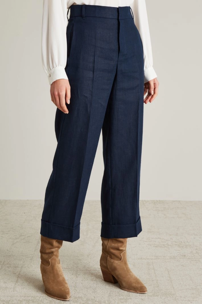 Straight and loose fit trousers in pure linen canvas, with belt loops at the waist, side pockets inserted in the seam, pressed crease lengthwise and hem with cuff. Hidden fastening with zip, button and hook.
