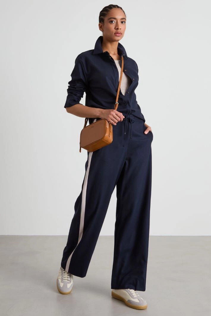 Straight, soft-fit trousers in stretch wool flannel, with drawstring, elasticated waistband on the back, French pockets and hidden fastening with zip, button and hook.