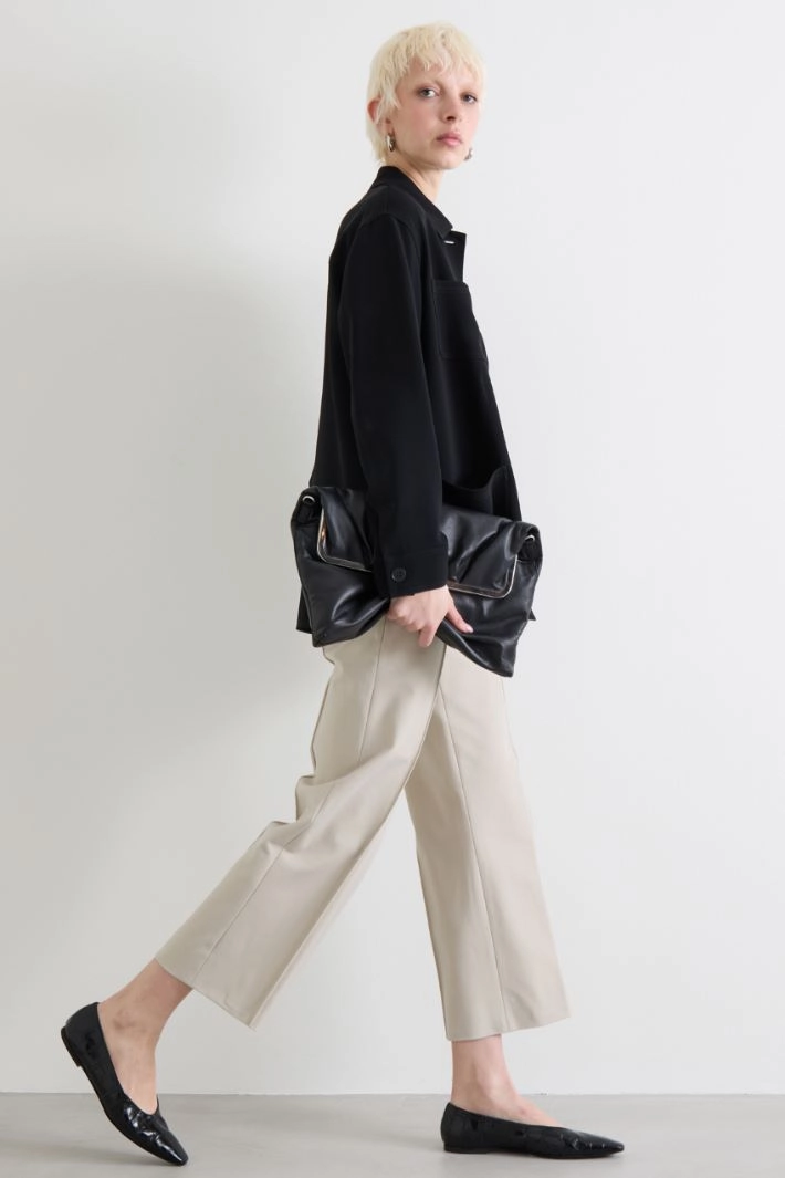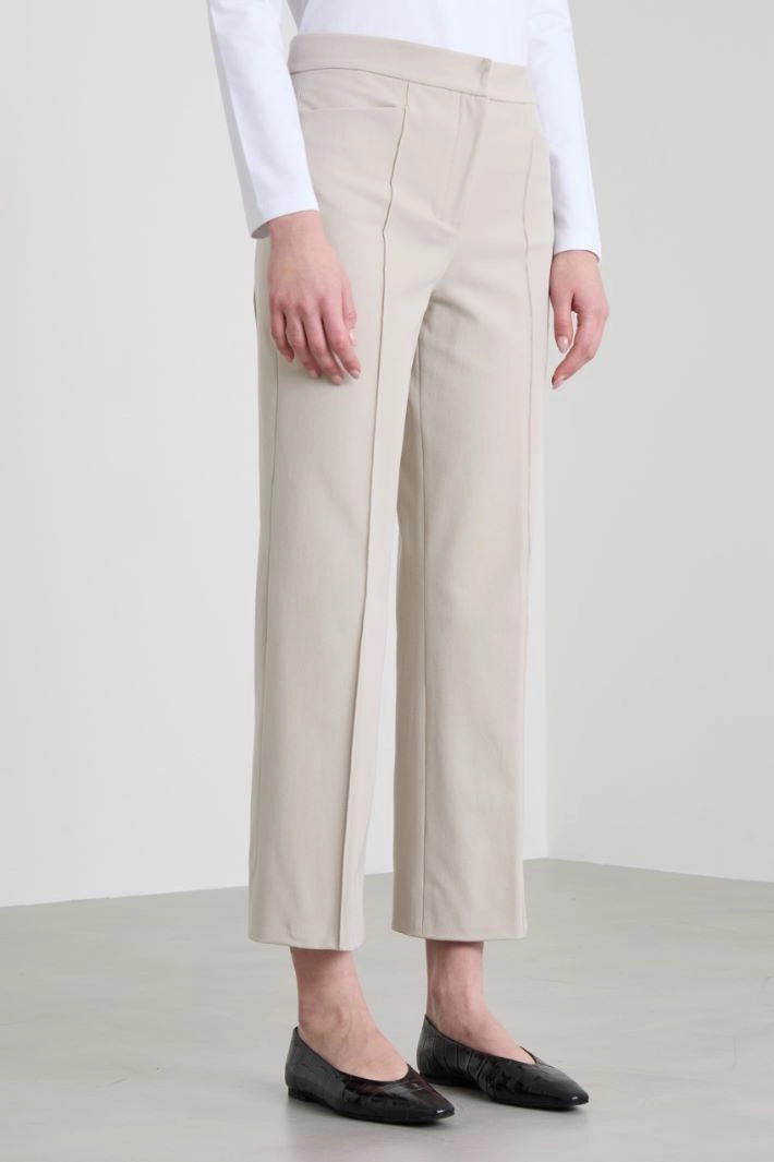 Straight-fit trousers in stretch cotton blend twill fabric, with French side pockets, pleat stitched along the length and hidden fastening with zip, button and hook.