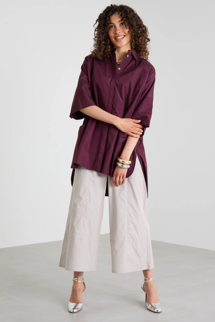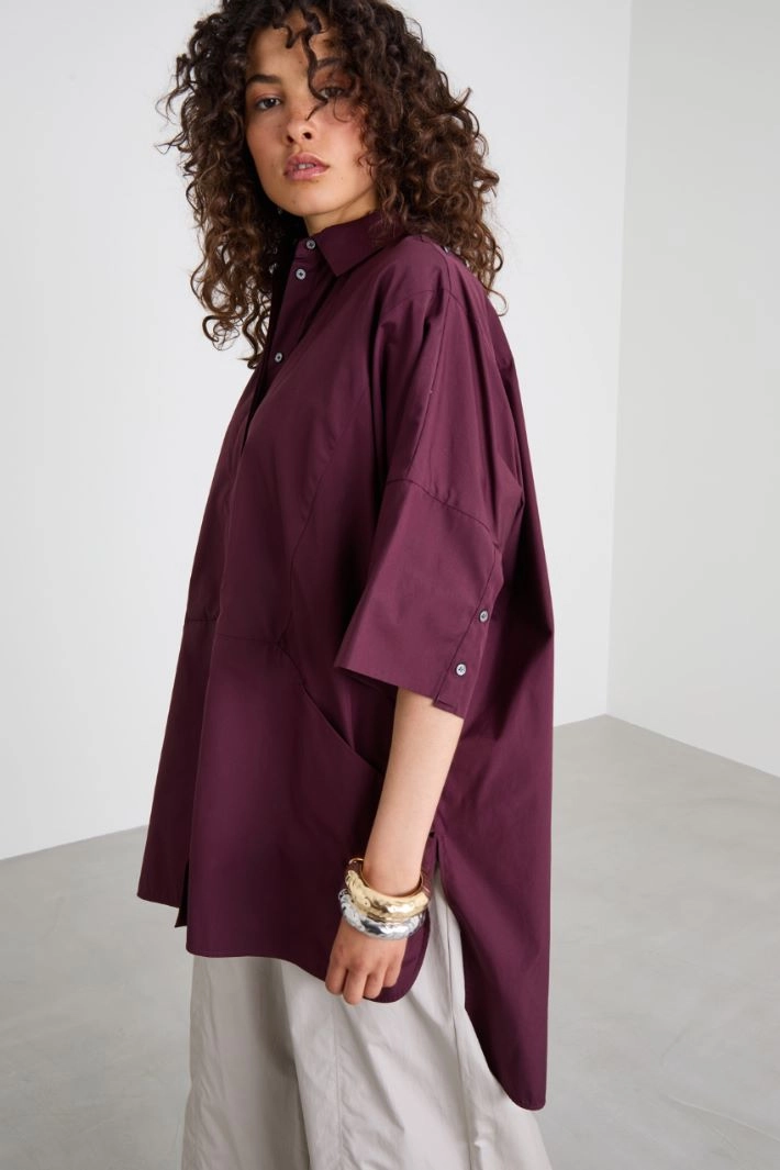 Straight-cut tunic in pure cotton poplin, with classic collar, three-quarter kimono sleeves, kangaroo pockets and rounded asymmetric hem with slits. Fastened with hidden buttons.