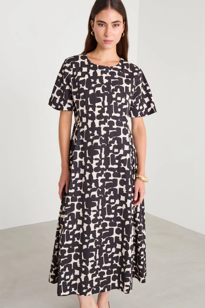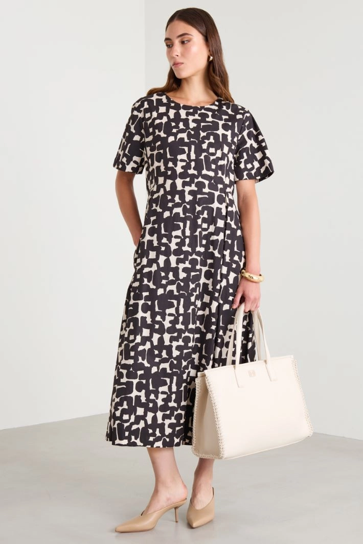 Flared midi dress in printed pure cotton poplin, with crew neck, short sleeves, inset side pockets and fastening with invisible zip on the back. Semi-lined.