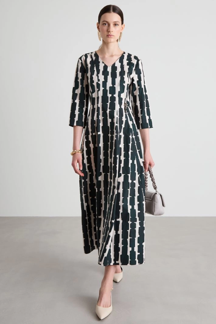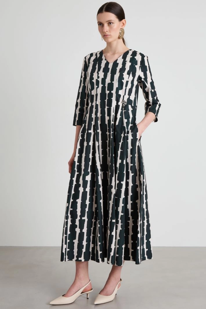 Flared dress in printed pure cotton poplin, with V-neck, three-quarter sleeves, removable rhinestone motif at the waist, inset side pockets. Invisible zip fastening on the back.